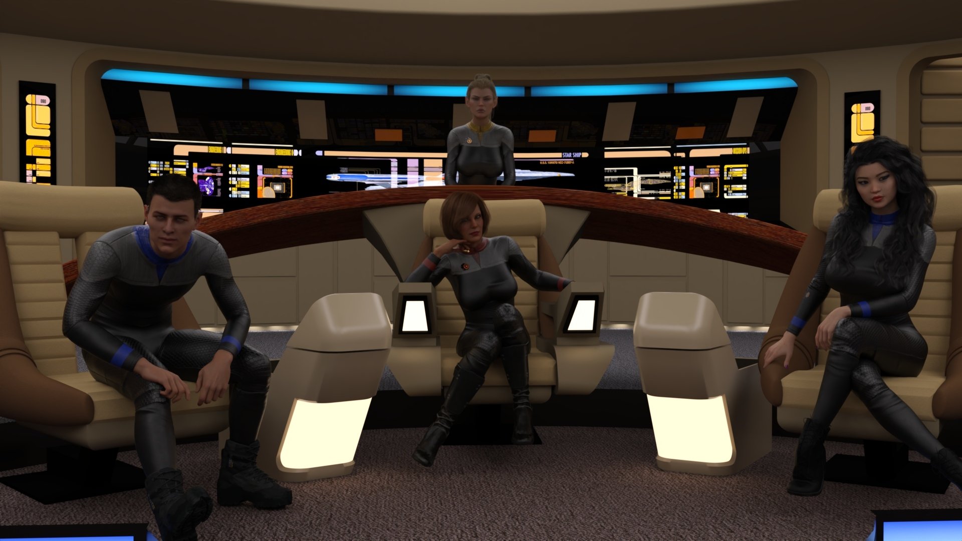 In this adult visual novel, you will play as Ensign [Your Name], and explore the Alpha Quadrant, under Captain Kateway's orders, with the help of her sexy crew. Protect the Federation and uphold its values, by joining the newly created Mobile Interstellar Liaison Force (MILF).